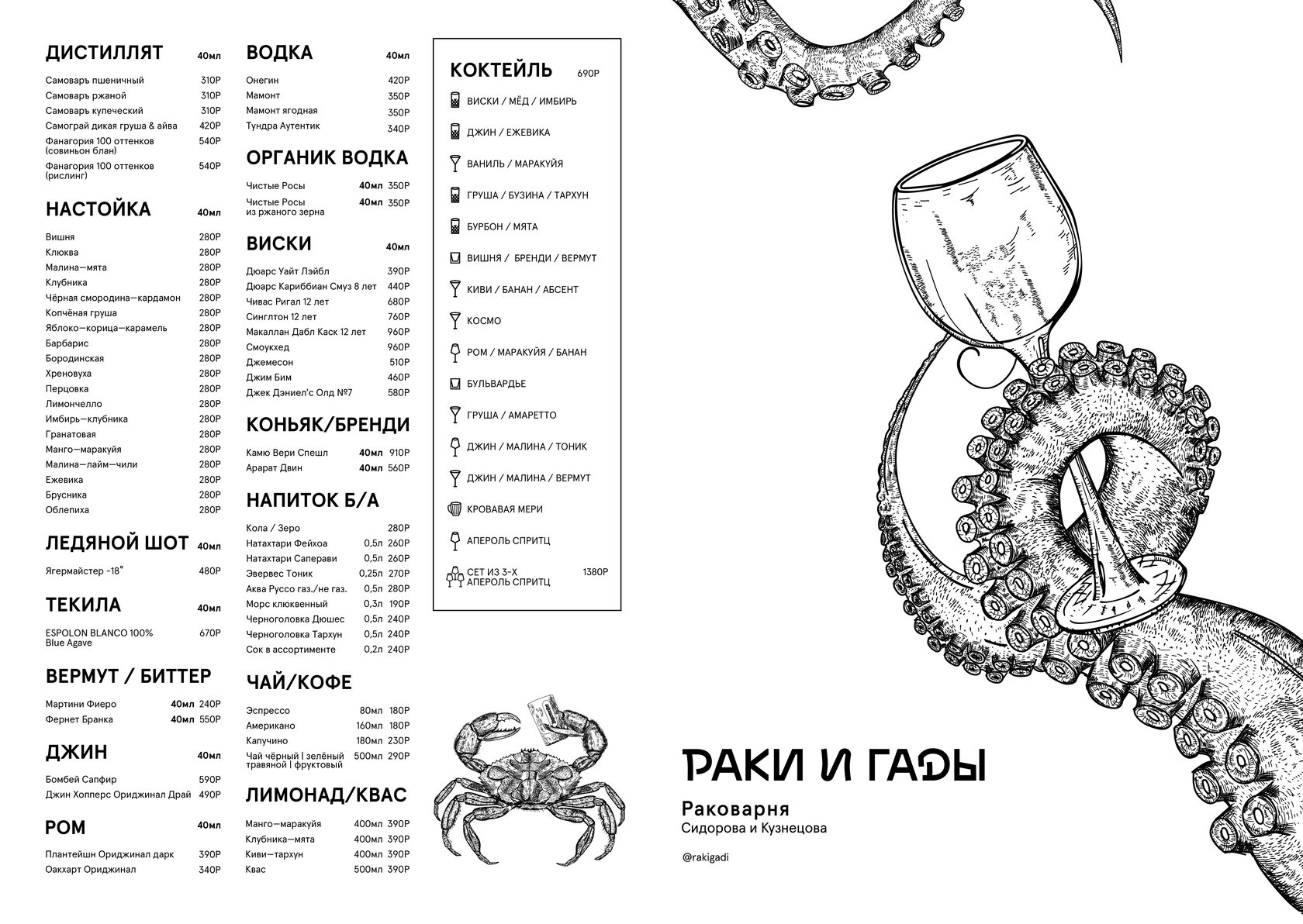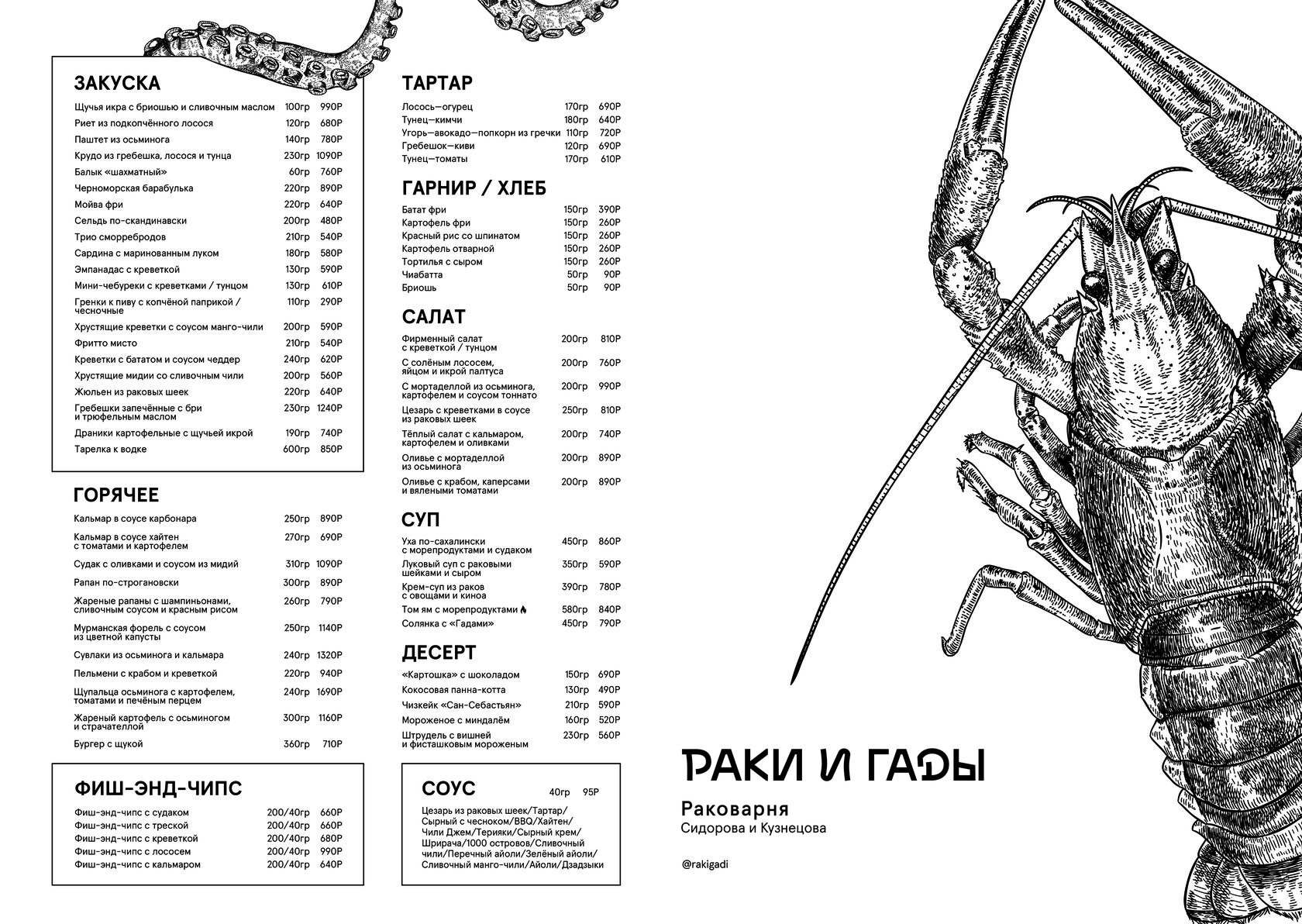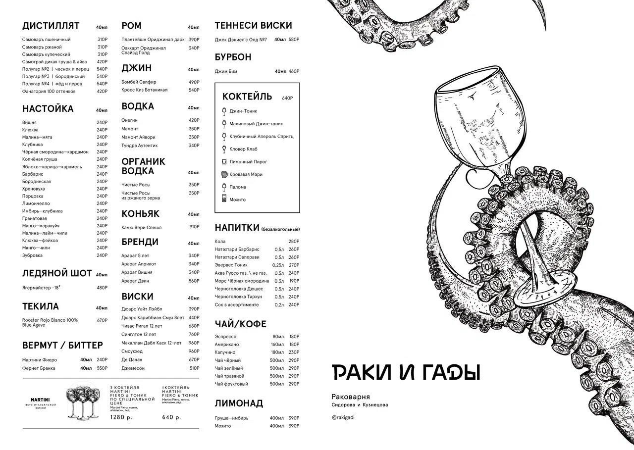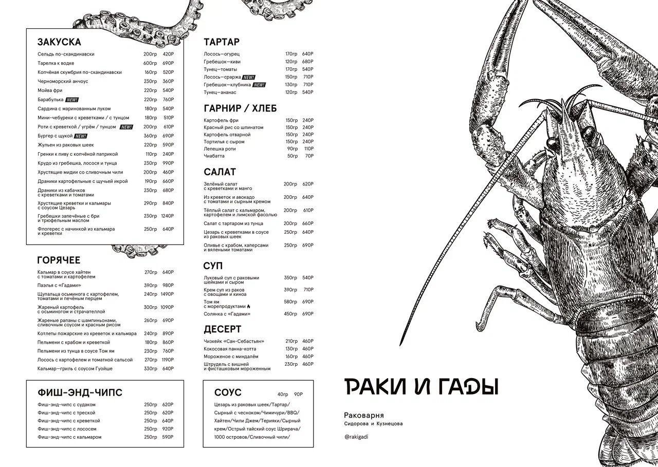 Современная кухня, бар с авторскими настойками и команда, которая работает здесь с первых лет — всё это создаёт ту самую атмосферу, с которой началась история «Раков и Гадов».